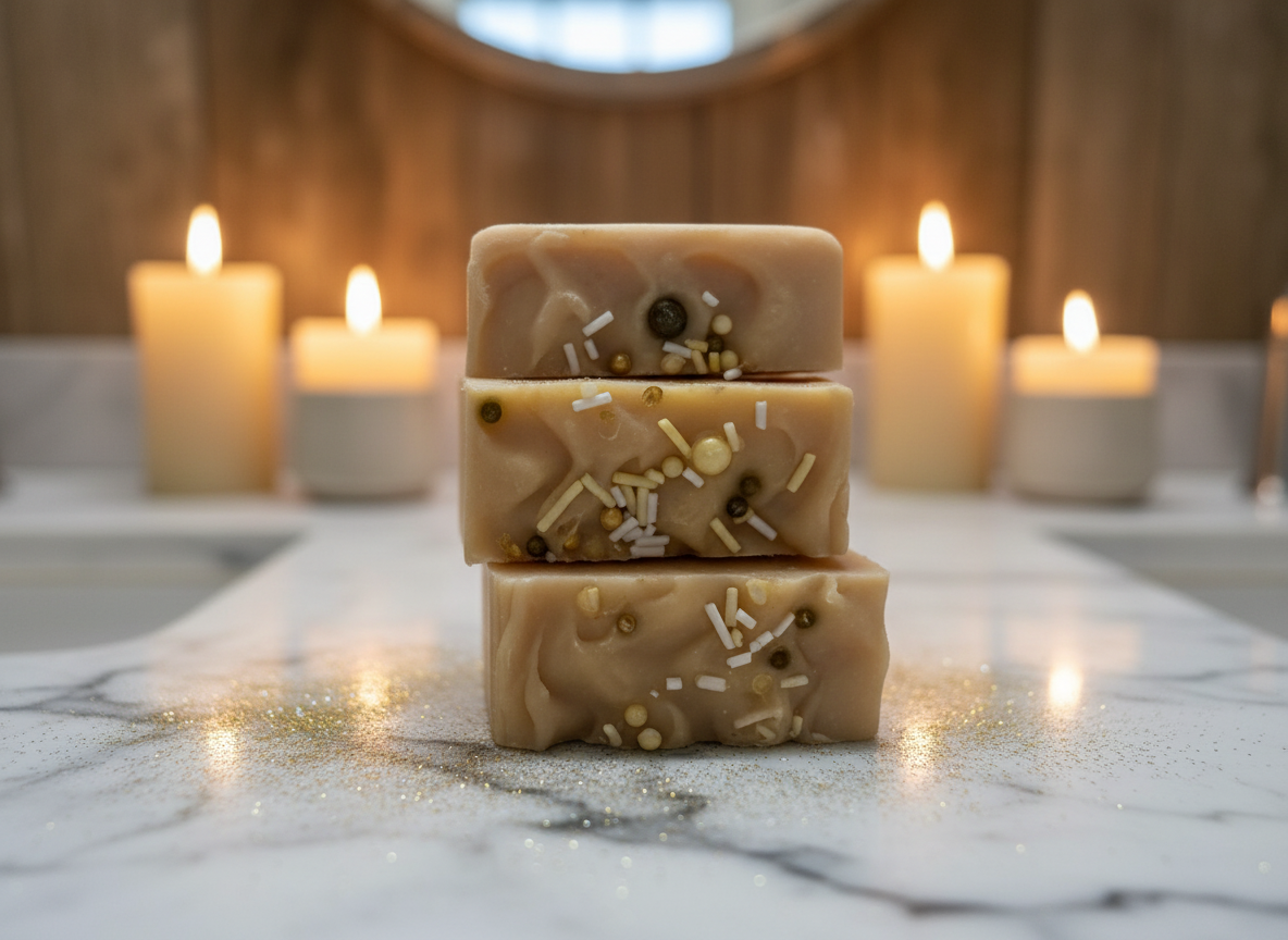 Made With: Olive, castor, coconut & palm oil (roundtable on sustainable palm), shea butter, Beezwax, sodium hydroxide, mica, water, fragrance.